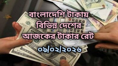 বাংলাদেশি টাকায় বিভিন্ন দেশের আজকের টাকার রেট ০৯ ফেব্রুয়ারি ২০২৬