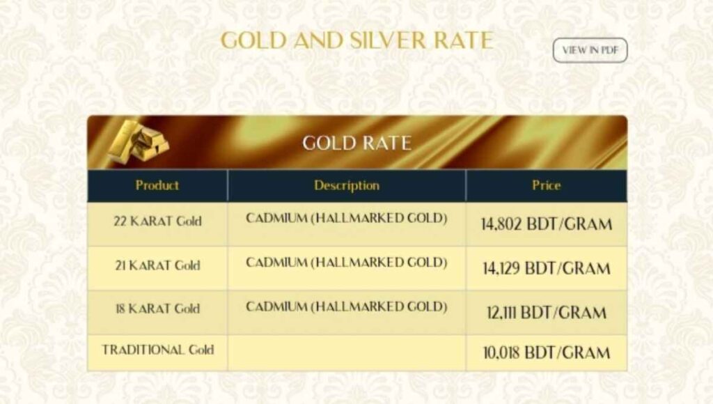 ২৪ ক্যারেট (১১.৬৬৪ গ্রাম/ ১ভরি) | (আনুমানিক মূল্য) ১৭৭,৩১৬ টাকা |