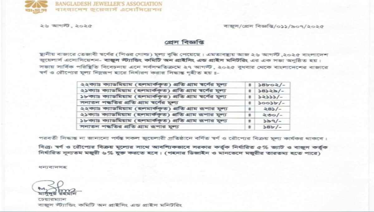 ইতিমধ্যেই গত ২৬ আগস্ট ২০২৫, বাজুস কর্তৃক আবারো নতুন করে নির্ধারিত হয়েছে বাংলাদেশে বিভিন্ন ক্যারেট স্বর্ণের মূল্য। আমদানিকৃত বস্তু হিসাবে উক্ত নির্ধারিত দাম অনুযায়ী বাংলাদেশের স্বর্ণের দাম বেড়েছে বই কমেনি। নির্ধারিত নতুন দাম অনুযায়ী অলংকার উপযুক্ত সর্বোত্তম বিশুদ্ধ ২২ ক্যারেট হলমার্ককৃত প্রতি ১১.৬৬৪ গ্রাম (১ ভরি) সোনার দাম ১৭২,৬৫০ টাকা। এছাড়াও, বিশুদ্ধ ২৪ ক্যারেট প্রতি ১১.৬৬৪ গ্রাম (১ ভরি) পাকা সোনার মূল্য আনুমানিক ১৭৭,৩১৬ টাকা। একই সময়, অলংকার উপযুক্ত বিশুদ্ধ ২১ ক্যারেট হলমার্ককৃত প্রতি ১১.৬৬৪ গ্রাম (১ ভরি) সোনার দাম ১৬৪,৮০০ টাকা। একই প্রকার হলমার্ককৃত বিশুদ্ধ ১৮ ক্যারেট প্রতি ১১.৬৬৪ গ্রাম (১ ভরি) সোনার দাম ১৪১,২৬২ টাকা এবং সনাতন পদ্ধতিতে প্রতি ১১.৬৬৪ গ্রাম (১ ভরি) সোনার দাম ১১৬,৮৪৯ টাকা চলছে আজ।
